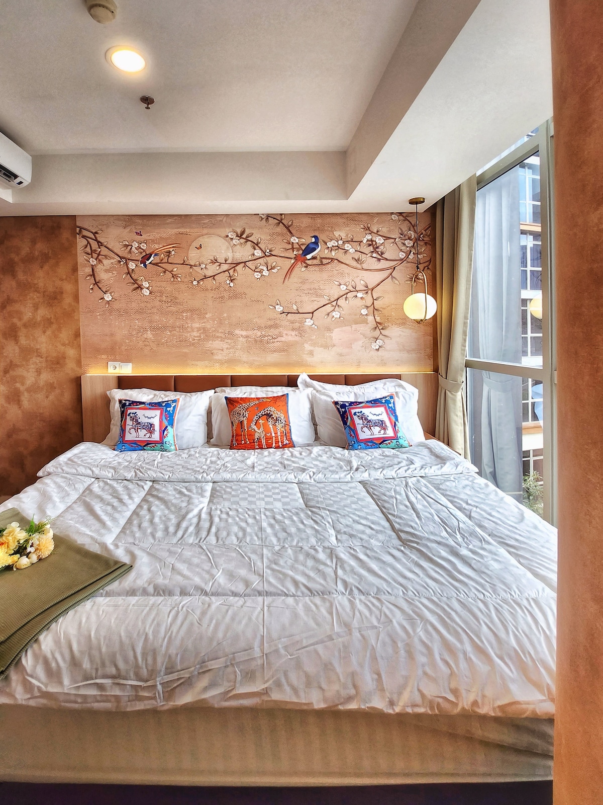 A spacious, cozy 1-bedroom apartment with a living room and balcony at Citralake Suites, West Jakarta's ideal lakeside getaway. Conveniently located just minutes from the Airport, PIK, Puri Indah and Sunset Avenue, it’s easy to explore the city. Step outside and you’re just a 1-min walk from Ciffest, a lively dining area with plenty of food options, supermarkets and ATMs. Our 1 BR unit provides a luxurious and comfortable space for up to 3 guests, with a kitchenette, Free Wi-Fi, and Netflix.