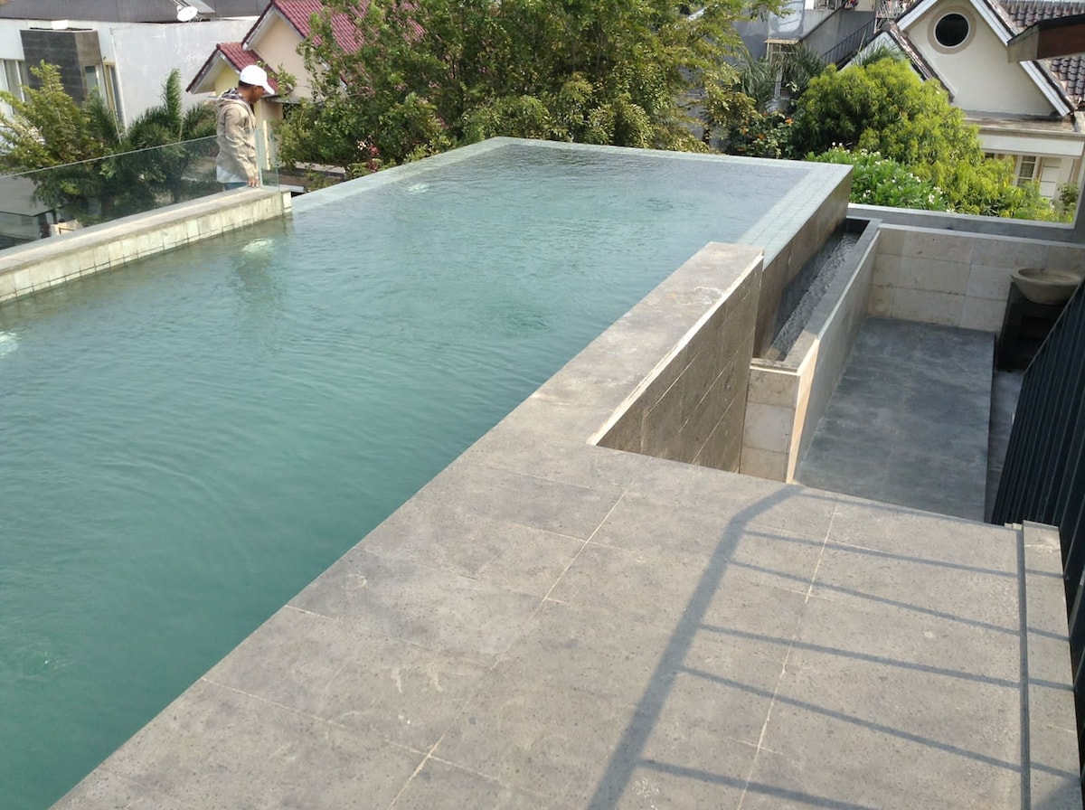 House of Belasun is a privately owned, luxurious contemporary estate that consists of 1 rooftop suite and 2 standalone villas. Situated on a higher location, it offers tranquil views of the Indian Ocean. Close to the beach, the city and a wide range of family-friendly attractions. Accommodates up to 15 guests and can be rented individually or by a group (see our other listings). Each room has direct access to our 15 x 6-meter infinity swimming pool that overlooks the Pelabuhan Ratu Bay.