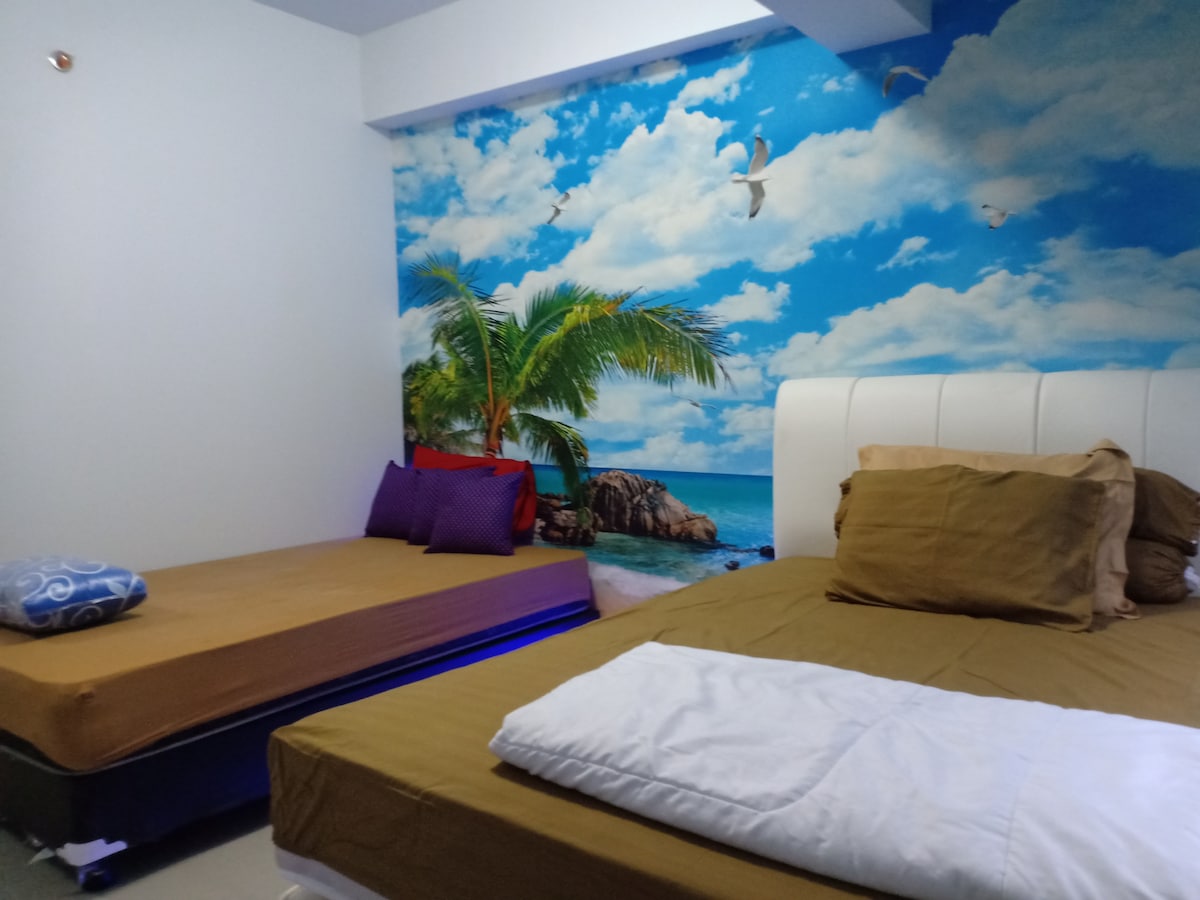 Enjoy a renovated 2-bedroom flat on the 7th floor with free pool and gym access. Furnished with Javanese handicrafts, it blends comfort and local charm. Located in a vibrant university area, steps from shops, cafés, and restaurants—ideal for work or leisure. This is a self-service accommodation; guests keep the space tidy. Additional cleaning must be requested in advance with an extra fee.