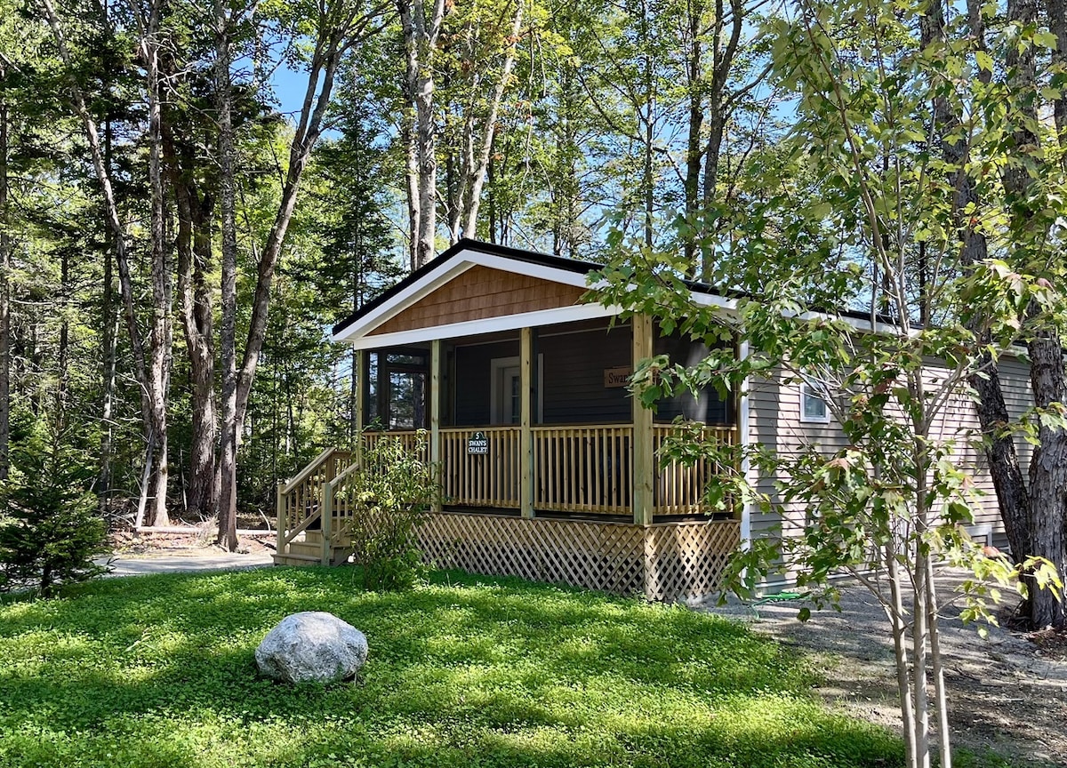 Nestled in the woods in the heart of Mount Desert Island, Acadia Woods Cottages are fully equipped 2 bedroom homes that are the perfect launching place from which to explore Acadia National Park and MDI. Swans Chalet has a fully stocked kitchen, heat/AC, W/D, smart TV/internet, grill, screened porch, community fire ring, games, picnic pavilion and more! The cottages are just 7 minutes from the main entrance to Acadia NP and a short drive to nearly everything else on the Island.