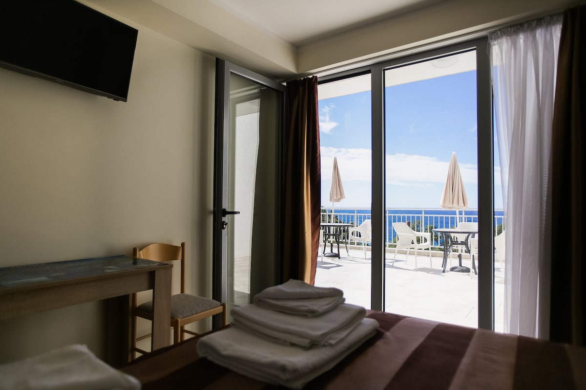 Enjoy the sunsets on our beautiful shared terrace with an exquisite sea view. This studio is perfect for a getaway for 2. The sea is 10 minutes walk from the villa and we are located just outside Petrovac - close enough to pop into the city but far from loud summer crowds.