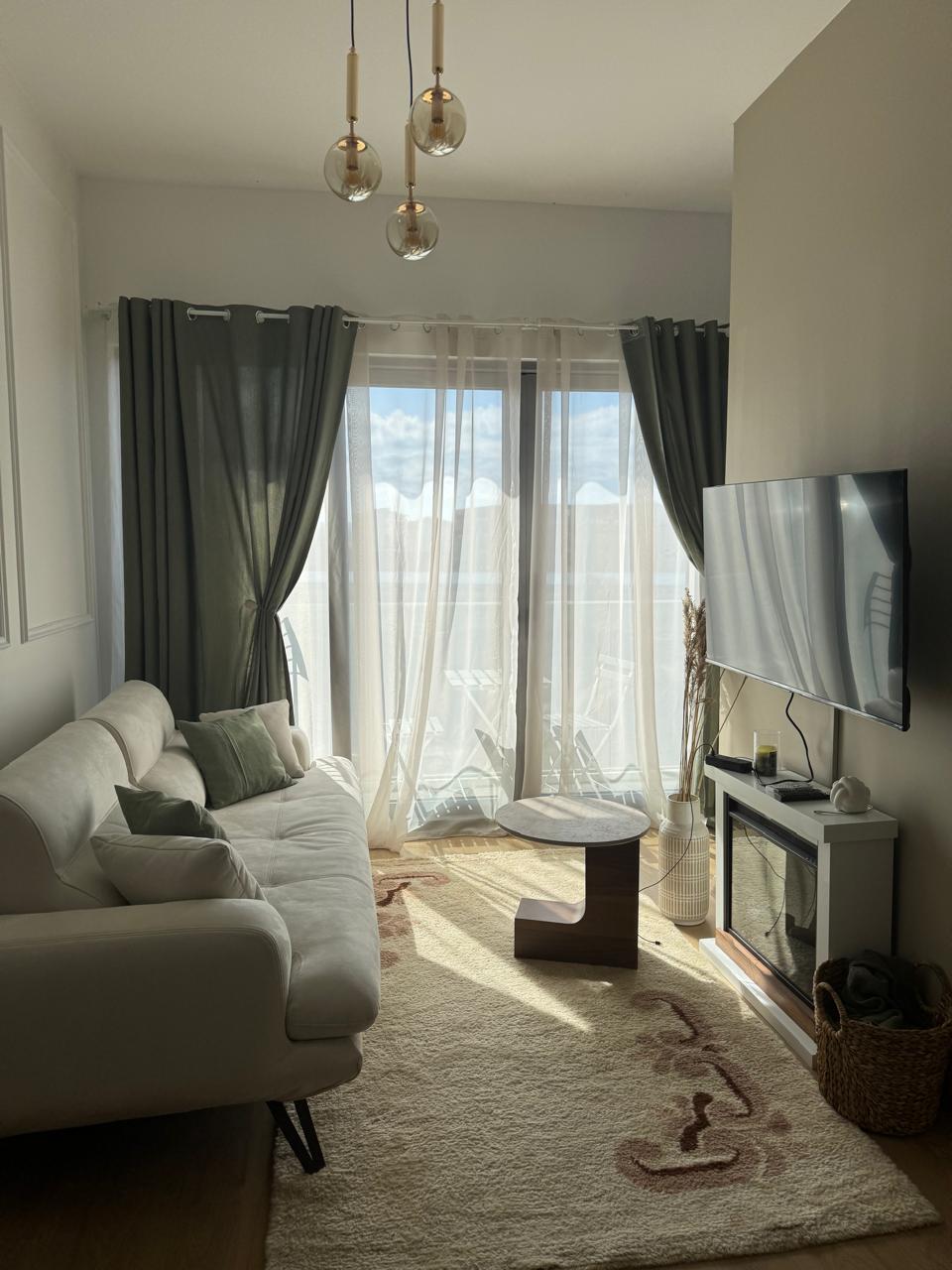 В вашем распоряжении стильно оформленная студия 46м2 с боковым видом на море в хорошей комплектации: кондиционирование, подогрев полов по всей квартире, современная новая мебель, полная кухня: холодильник, посудомоечная машина, плита, духовка, СВЧ печь, чайник, вся кухонная утварь, плоскоэкранный телевизор, ванная комната укомплектована стиральной машиной и феном, интернет, спутниковое телевидение, гладильные принадлежности. Из окон открывается панорамный вид на горы и море.
