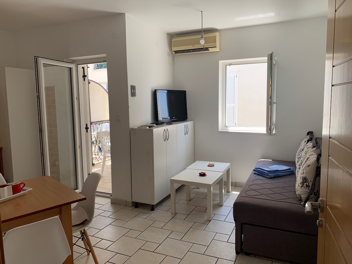 The apartment is located right next to the sea port and the beach. City center, two groceries, a lot of bars and cafes within walking distance. There is one bedroom with balcony and studio area with kitchen, TV, two sofa-beds, dining table and with balcony as well. Both rooms with air condition. In the kitchen you can find any kitchen equipment you would need. You can find all the necessary bedding in the wardrobe and pantry. Small bathroom with a washing machine, washbasin and shower.