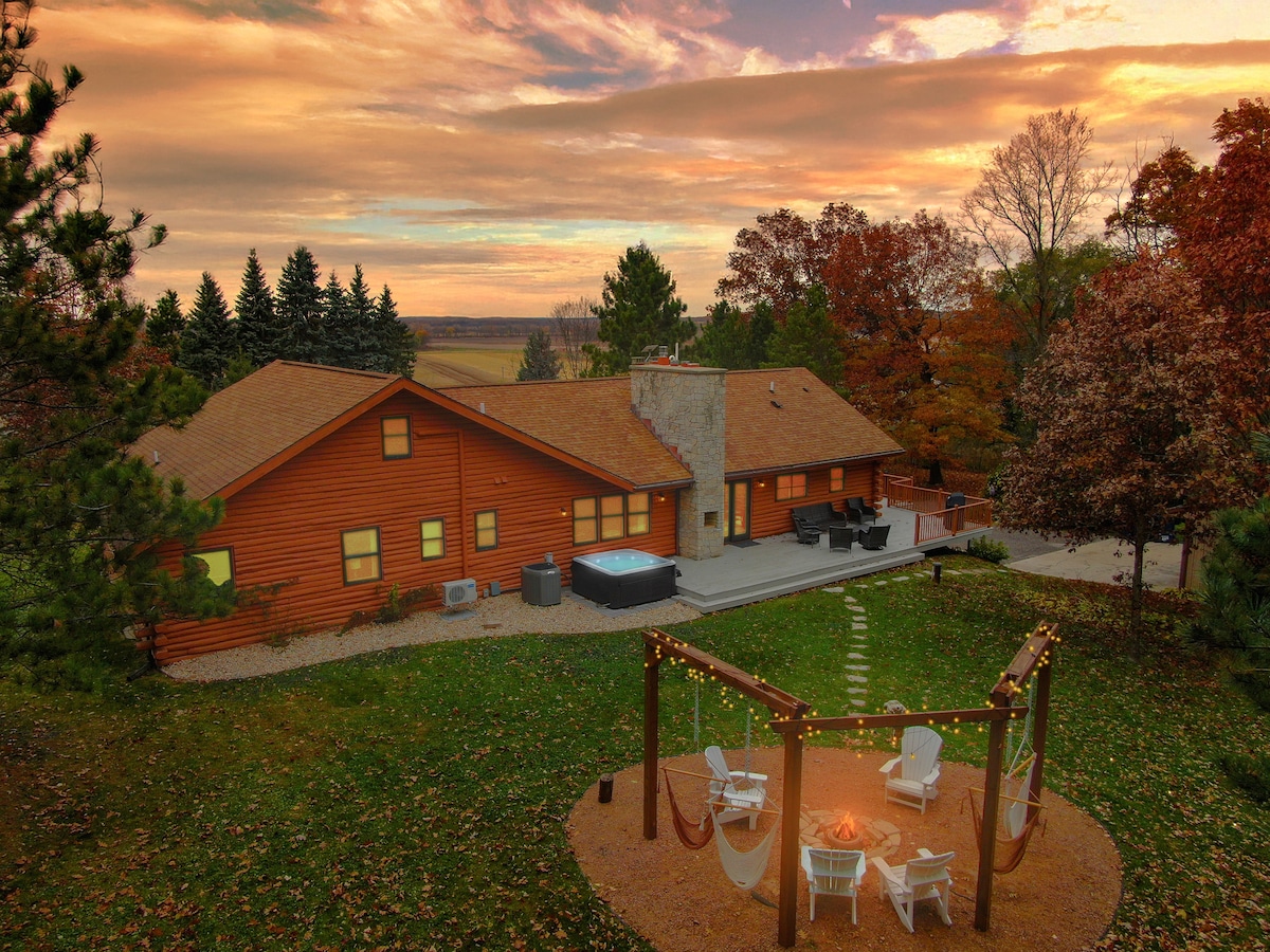 Welcome to our home: where we have found peace and relaxation for over 20 years. A German native, Big R fell in love with the open land and rolling hills of Wisconsin, becoming a US citizen in the 80s. He met Curly, a Chicago city girl, who brought a little city to his country life. They enjoy raising buffalo and spending warmer days on their porch enjoying the fresh air and beautiful views (with no mosquitos!). Now they want to share their idyllic and peaceful home with you. Drive down a dead-end road and pull up to a rustic cabin filled with high-tech and cozy amenities. We have something for everyone with a gas fireplace, tv (complete with dish, Cinemax, HBO and a Bluetooth sound system), board games and a full kitchen. Take a drink outside to soak in the hot tub or sit around the campfire. When the day is done, you will fall asleep instantly on the memory foam bed, either in the loft or the bedroom, and wake up to a beautiful sunrise looking out over your little getaway.