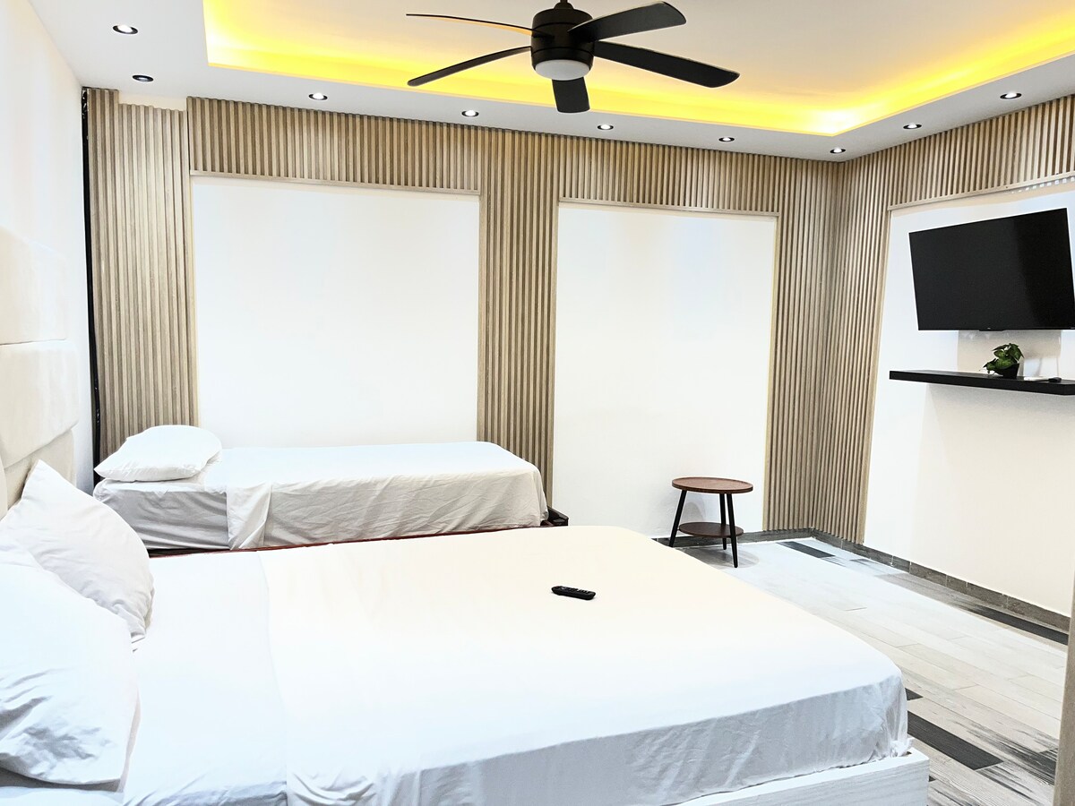 Una habitación con dos camas, sabanas,almohadas,toallas, acondicionadores de aire, baño privado,papel higiénico,jabon baño y jabon liquido de mano. Es una urbanización tranquila y con pocos ruidos para que asi tenga un feliz descanso.