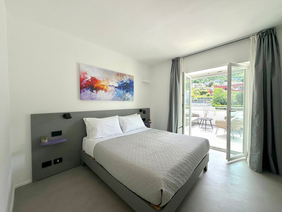 Spacious apartment on the upper floor of a two-family villa, tastefully furnished and fully equipped with all the amenities for a comfortable stay. It offers independent access with private parking and large outdoor spaces with views of Monte Epomeo. Located 50 meters from the bus stop, 30 meters from a supermarket, and 500 meters from the center of Panza. Beaches and tourist attractions are easily accessible, making it the ideal place to relax and explore the island.