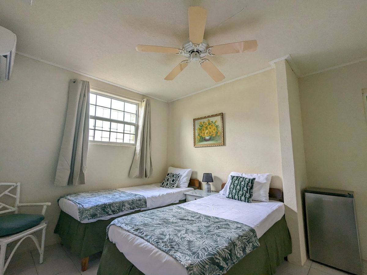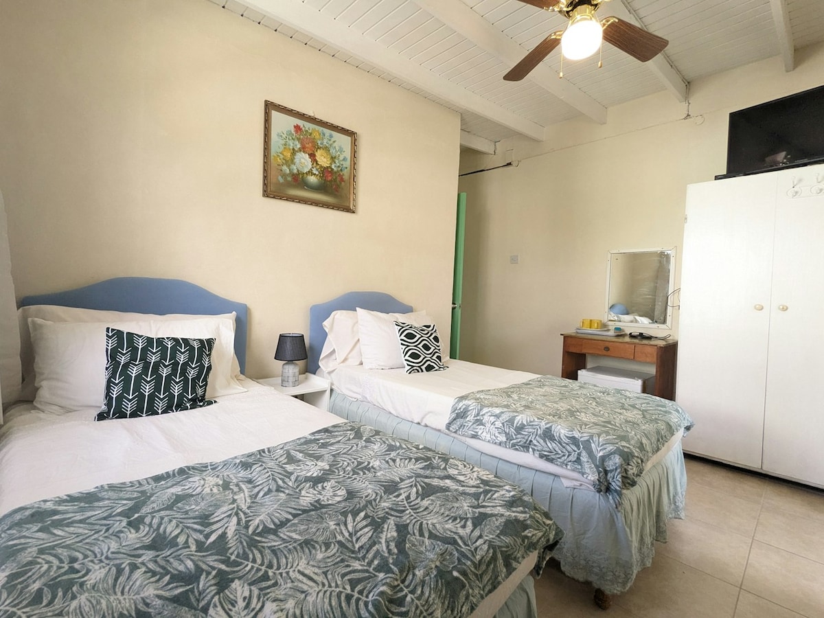 This is a completely separate cottage at the rear of our own home, on a quiet cul-de-sac, about one minutes "stroll" down to "our" (Rockley/Accra) beach. There's a large bedroom with ensuite bathroom, and a smaller second bedroom. Open plan with fully equipped kitchen, dining area and living room. Veranda, small courtyard and a lawn. Within easy walking distance are a bank, doctor and pharmacy, a sports bars, a beach bar, 5 restaurants, a convenience store and 2 supermarkets.