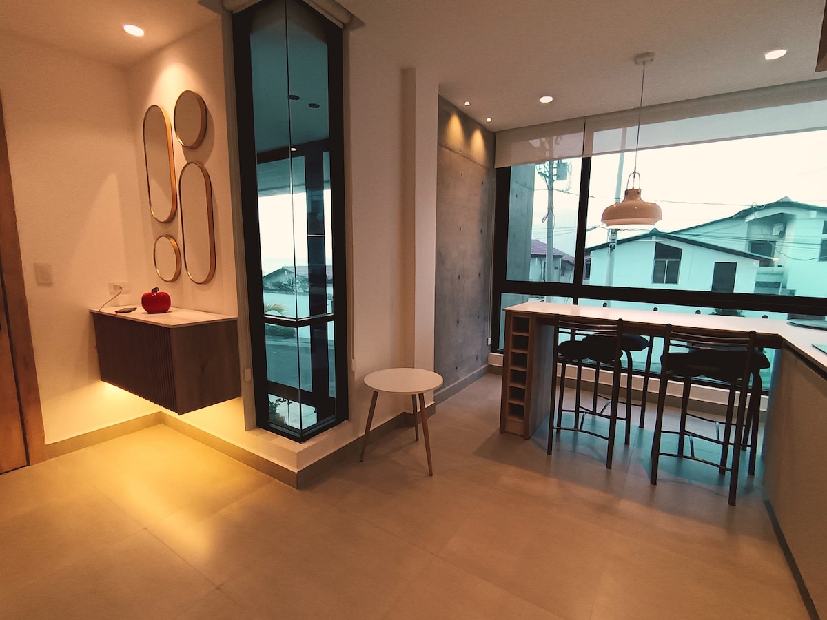 Relájate en un espacio tranquilo y elegante, ubicado a pocas cuadras del Mall del Pacífico, la Playa Murciélago y excelentes restaurantes. Disfruta de un edificio seguro y moderno con ascensor, piscina y garaje. Ideal para cualquier estadía, cuenta con espacio de trabajo, cocina equipada, lavadora y secadora. Un lugar diseñado para brindarte confort, estilo y una experiencia placentera desde el primer momento.
