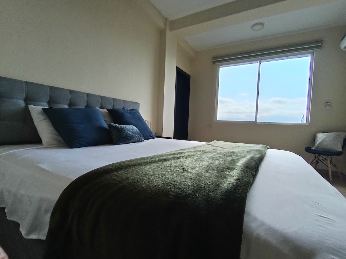 Descubre el lujo y la modernidad en nuestro departamento completamente nuevo con vista al mar. Disfruta de una amplia sala de estar con ventanales que ofrecen vistas impresionantes, una cocina equipada con electrodomésticos de alta gama y un dormitorio principal con baño privado y cómoda cama Queen size. Relájate en la terraza privada con una cena al aire libre. Todo en un ambiente exclusivo y sofisticado. ¡Vacaciones de ensueño esperan por ti!