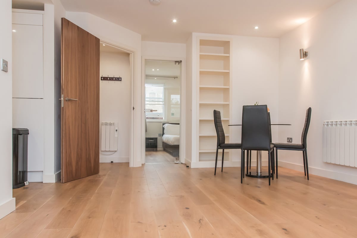 Contemporary two bedroom flat near Farringdon station. It is a newly refurbished space within a beautiful 19th century building on the corner of Sekforde Street and Woodbridge Street. The flat is adjacent to The Sekforde, a popular pub. This does tend to get busy with the possibility of being noisy. You will have your own private entrance. Excellent location for bus links, overground, and underground stations. This is an ideal space for short-stays!