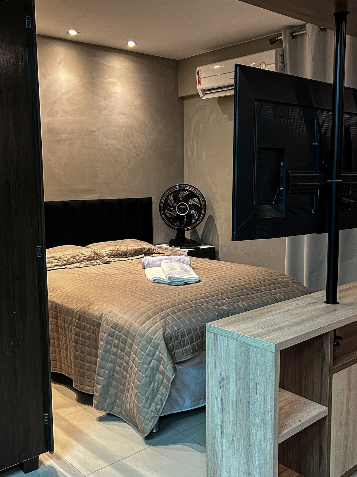 Este estúdio foi pensado para oferecer conforto, praticidade e estilo em cada detalhe. O ambiente é novo, climatizado e decorado em tons neutros, com iluminação em LED embutida no teto, criando uma atmosfera sofisticada e relaxante. Conta com cama de casal confortável, sofá cama adicional, mesa para refeições ou trabalho, e uma cozinha compacta equipada com pia, micro-ondas, frigobar e utensílios básicos. Tudo pensado para uma estadia prática e agradável.