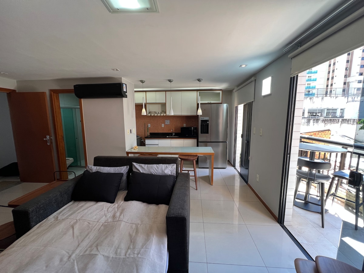 AP 1/4 moderno, aconchegante, em local seguro próximo de supermercado, shopping, bares/restaurantes, pontos turísticos andar alto, com vista, edifício com 2 piscinas, academia, hidro, sauna INCLUSO -Roupa de cama e toalhas - 1 vaga garagem - Cozinha completa - Lava louças - Maquina lava e seca roupas - Smart TV 65" c/ Netflix - Wifi - Alexa (Automação Residencial) - Cafeteiral Oster primalatte - Churrasqueira elétrica -Ar-cond no quarto e sala - Ferro de Passar - Secador