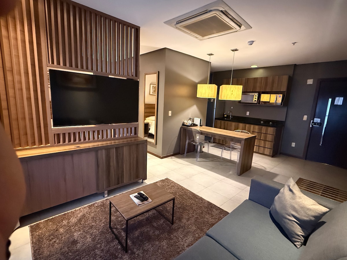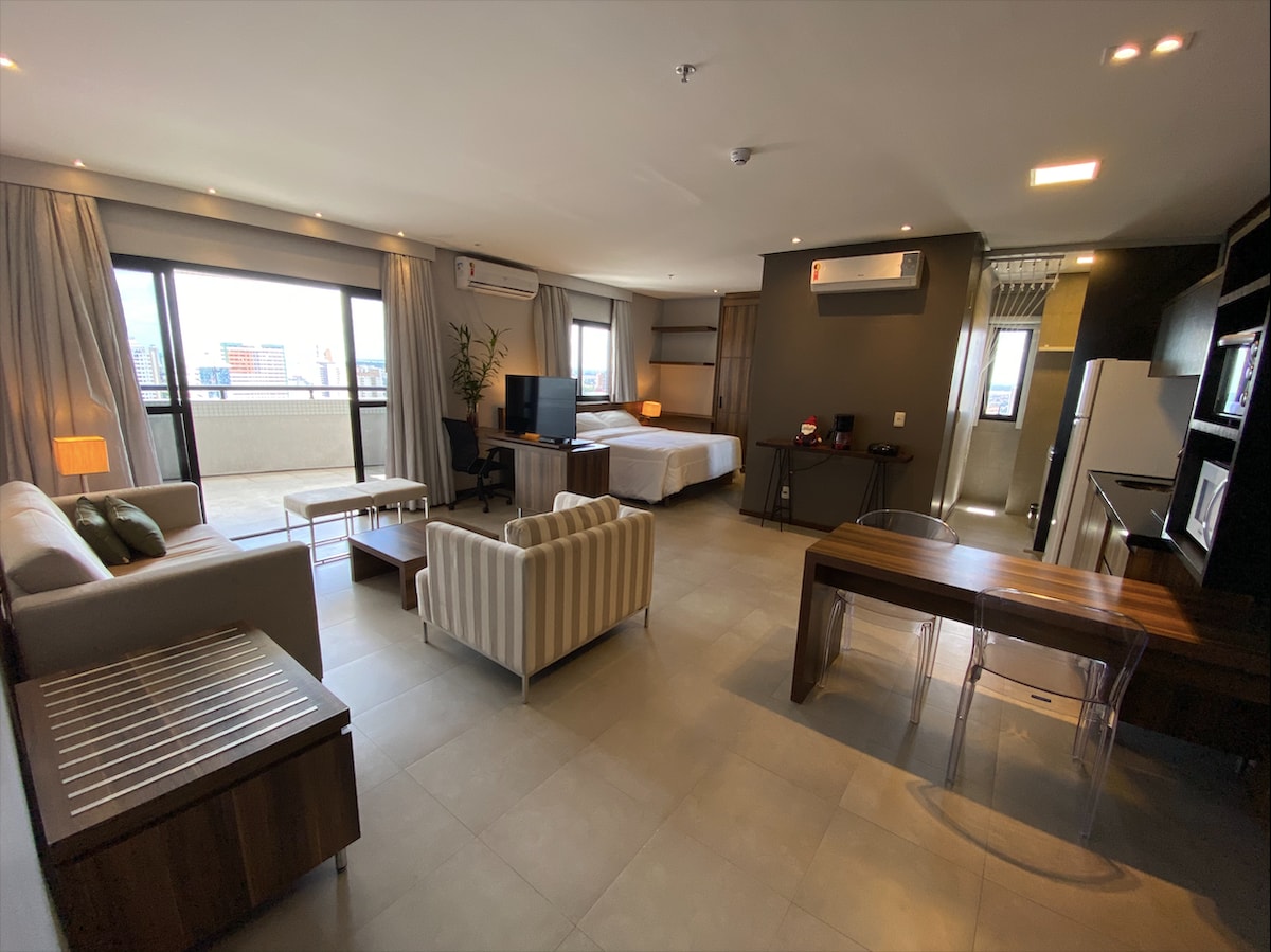 Flat moderno com eletrodomésticos . Possui 42 m2, havendo quarto com ar condicionado e televisão. O banheiro possui água quente no chuveiro e na pia. A cozinha é completa com fogão tipo cook top, forno de microondas e frigobar. Wi-Fi gratuito. Há serviço de limpeza todos os dias já incluso no valor. Serviços de estacionamento, lavanderia e refeição não estão inclusos, sendo pagos durante o check-in.