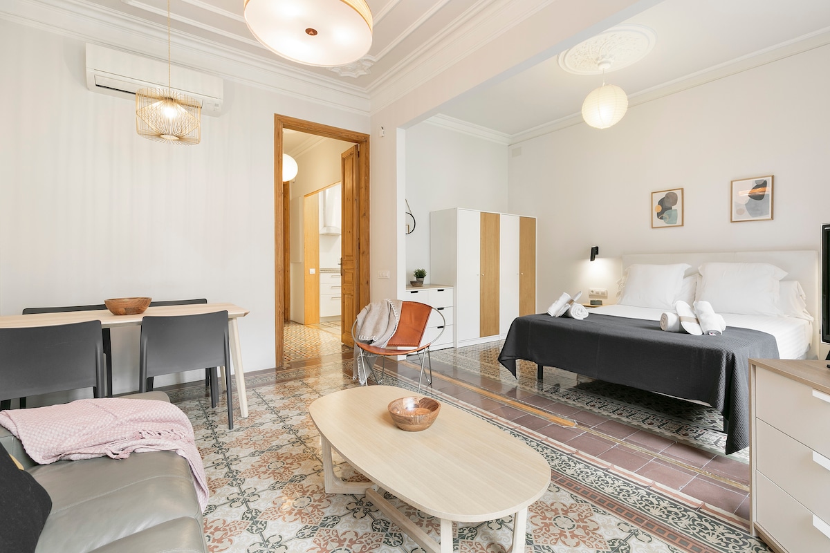 Stylish apartment on a semi-pedestrian street in the iconic Gracia neighborhood, 800 meters from Sagrada Familia and Hospital de Sant Pau, and a 20-minute walk to Parc Güell or Passeig de Gracia. Comfortable, quiet, and elegant, the apartment is fully renovated. It features a queen-size bed, high-quality linens and towels, AC, kitchen, and sofa bed. Enjoy 2 SmartTVs (Netflix, HBO...) and high-speed Wi-Fi. This cozy apartment offers access to a beautiful, dynamic neighborhood from a serene street