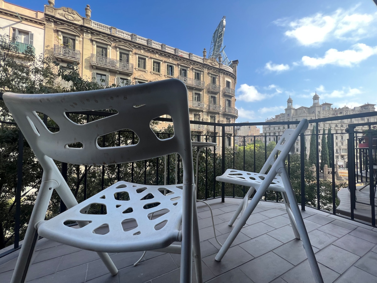 87 square meters 5th floor building 2 lifts All-day consierge services. Residential building 2 bedrooms; one very spacious doble with built-in wardrobe, privacy balcony with excellent views over Barcelona modernists arquitectire en-suite bathroom And a single rooom ideal for guest or home office Fully equipped kitchen Prime location Easy Connections to airport Walking distance to sans train station. 2 metro stations “ plaza España “ and “ rocaford” one street away