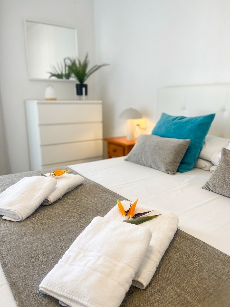 Enjoy natural light and sea views in this bright and comfortable apartment. 🛏️ Bedroom with a double or twin beds and living area with a sofa bed for 2 extra guests. 🍳 Fully equipped kitchen with cookware, coffee maker, toaster, kettle, and cleaning kit. 🛁 Bathroom with shower or bathtub, green tea toiletries, and hairdryer. 📺 TV, Wi-Fi, air conditioning, safe, bed linen, and towels included. Private terrace to relax. In summer, beach umbrellas and towels provided.