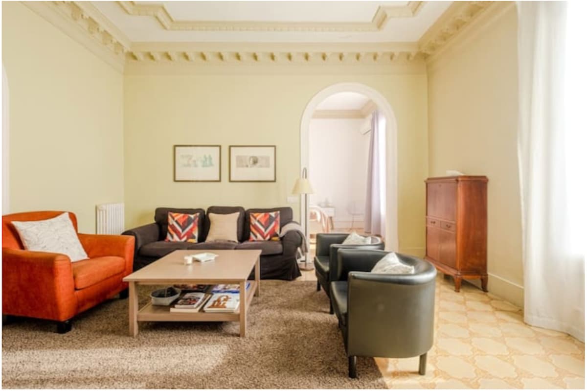 This exclusive four-bedroom three-bathroom apartment is in Barcelona’s fashionable and very central Eixample area, just near chic Passeig de Gràcia with its stunning Gaudí buildings and top designer stores. The reception is open from Monday to Sunday from 9:00 a.m. to 11:00 p.m. The apartment is very spacious and ideally designed for large groups. The shared rooftop terrace has a plunge pool and is great to chill out.
