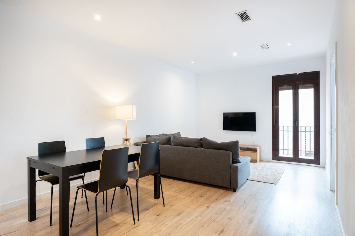 Welcome to your stylish and familiar 125m² retreat. Designed for supreme comfort, this contemporary apartment truly feels like a home away from home. Floor-to-ceiling windows bathe the space in light and connect you to a lush, beautifully arranged patio. Located near Sants Main Train Station (Sants Estació), our strategic position ensures exceptional connectivity with direct, easy links to the airport and city centre. Enjoy effortless travel and an unforgettable family or business stay.