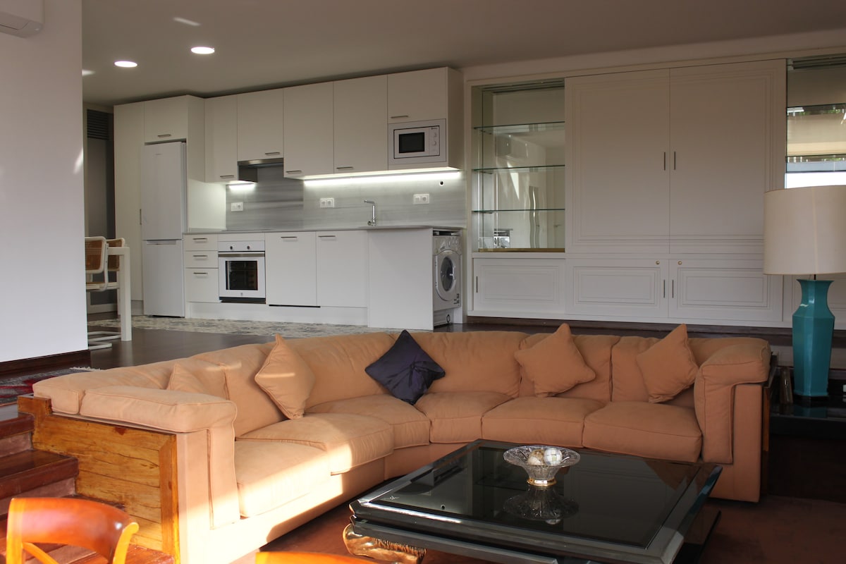 Welcome to your stylish and familiar 125m² retreat. Designed for supreme comfort, this contemporary apartment truly feels like a home away from home. Floor-to-ceiling windows bathe the space in light and connect you to a lush, beautifully arranged patio. Located near Sants Main Train Station (Sants Estació), our strategic position ensures exceptional connectivity with direct, easy links to the airport and city centre. Enjoy effortless travel and an unforgettable family or business stay.