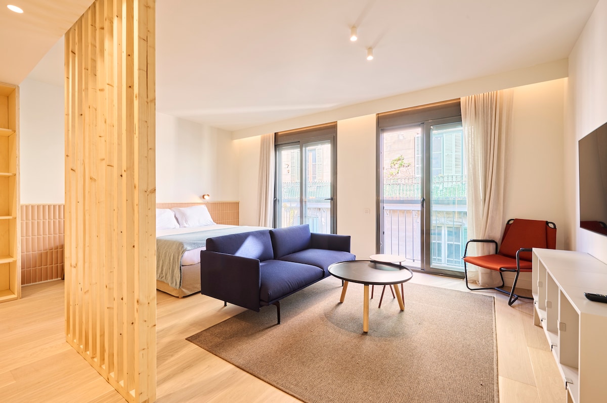 Eric Vökel BCN Suites This spacious 70m2 apartment features 1 bedroom with double bed and 1 bedroom with double bed or twin beds (upon availability), 2 bathrooms, one of which is en-suite to the master bedroom. It also offers a living/dining room with a fully equipped kitchen. Maximum capacity: 6 people (double sofa bed for 2 guests). For stays of 7 nights or more, weekly housekeeping is provided. Additional cleaning services can be booked at an extra cost. Bed linen and towels included.