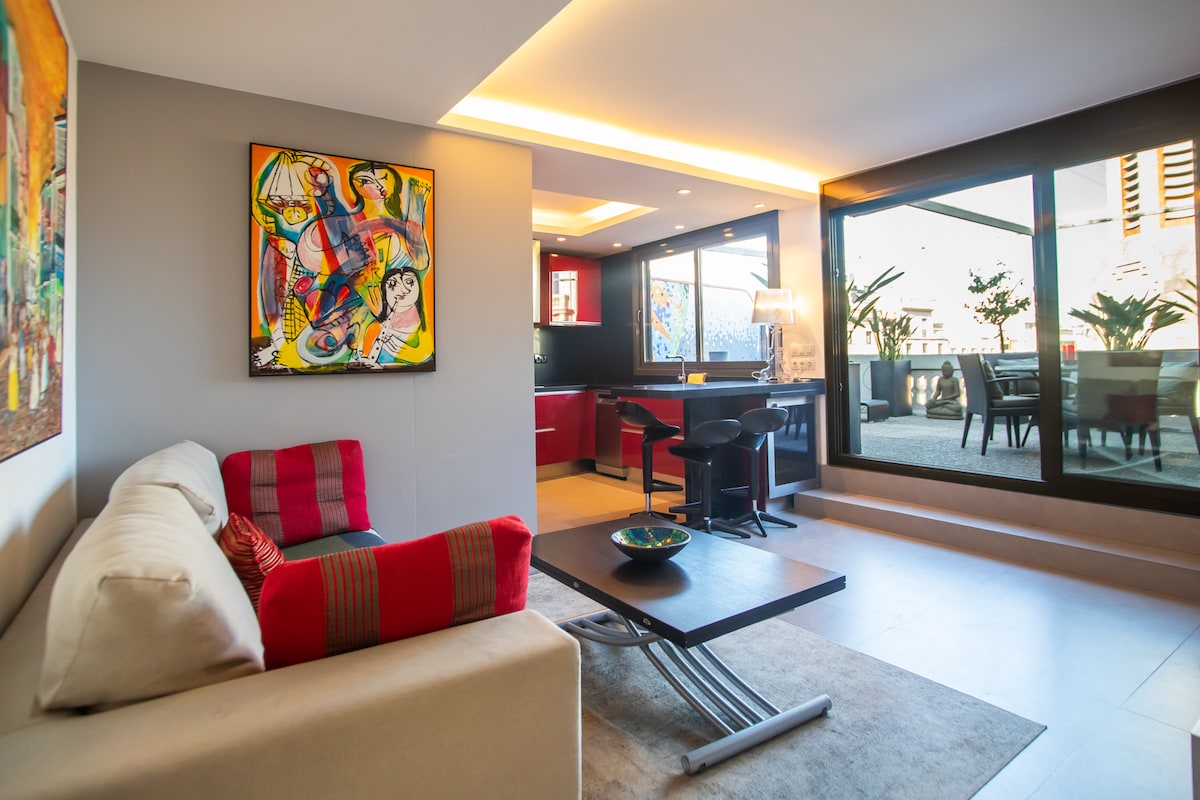 This exclusive four-bedroom three-bathroom apartment is in Barcelona’s fashionable and very central Eixample area, just near chic Passeig de Gràcia with its stunning Gaudí buildings and top designer stores. The reception is open from Monday to Sunday from 9:00 a.m. to 11:00 p.m. The apartment is very spacious and ideally designed for large groups. The shared rooftop terrace has a plunge pool and is great to chill out.