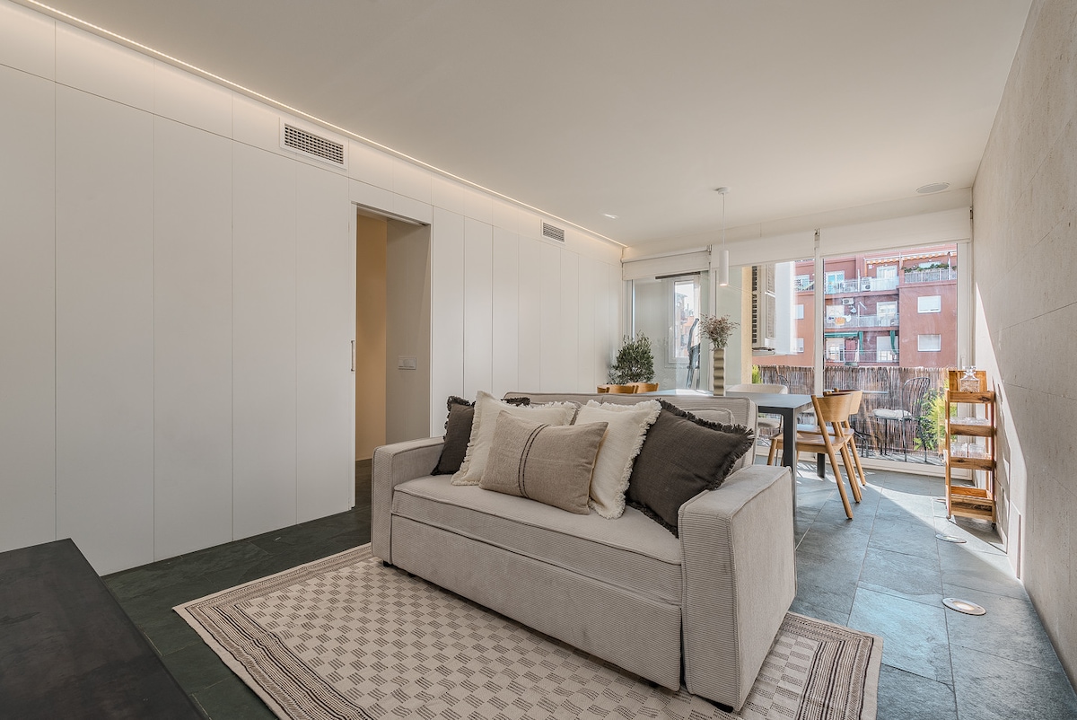 Stylish one-bedroom, one-bathroom apartment in the very central Sant Antoni area, ideal for up to four people. The bedroom has a double bed and there is a double sofa-bed in the living room that can sleep an extra two more people. It combines parquet floors & modern decor and is full of natural light. The apartment has a dining room with a large table, located near the kitchen.