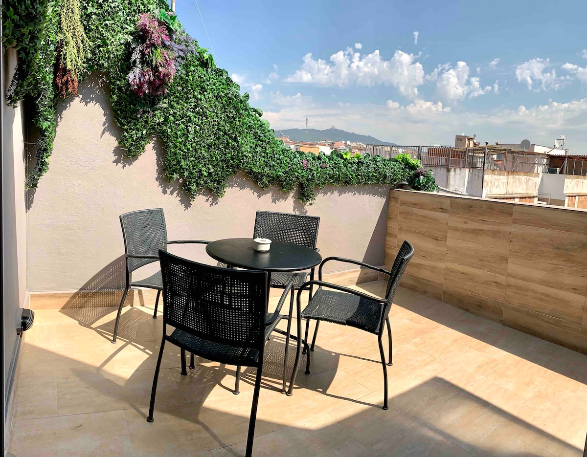 Right in the core of central Barcelona, a beautiful cozy and modern studio fully equipped to enjoy the most spectacular views of the city from a terrace of over 200 square meters, set to the most magical moments ...