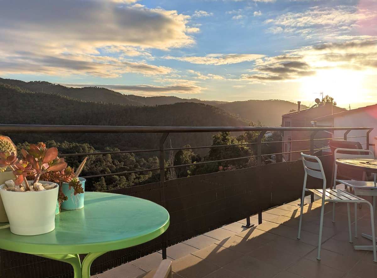 Pequeña casa con vistas increíbles a la montaña y al bosque de Collserola, rodeada de naturaleza, tranquilidad y aire puro. Los senderos que recorren el parque natural empiezan a pocos metros. Es un lugar perfecto para salir a caminar y desconectar totalmente si eso es lo que buscas. Pero además el barrio tiene una excelente conexión de transporte público con el centro de Barcelona.