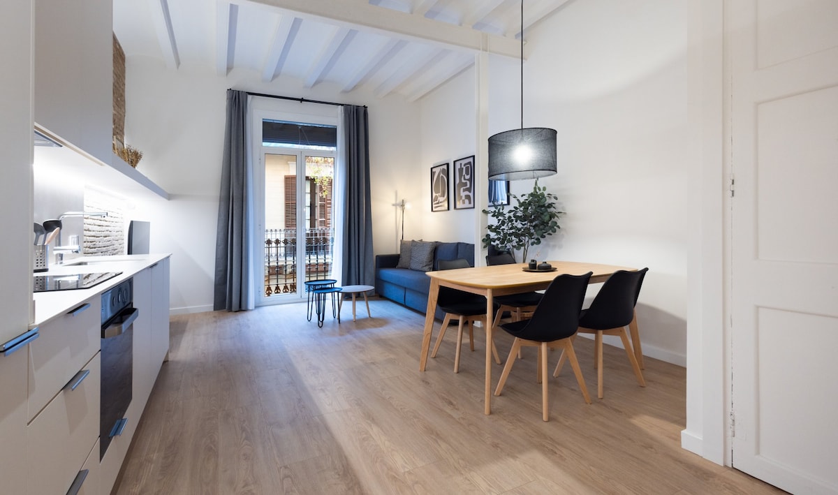 Stylish apartment on a semi-pedestrian street in the iconic Gracia neighborhood, 800 meters from Sagrada Familia and Hospital de Sant Pau, and a 20-minute walk to Parc Güell or Passeig de Gracia. Comfortable, quiet, and elegant, the apartment is fully renovated. It features a queen-size bed, high-quality linens and towels, AC, kitchen, and sofa bed. Enjoy 2 SmartTVs (Netflix, HBO...) and high-speed Wi-Fi. This cozy apartment offers access to a beautiful, dynamic neighborhood from a serene street