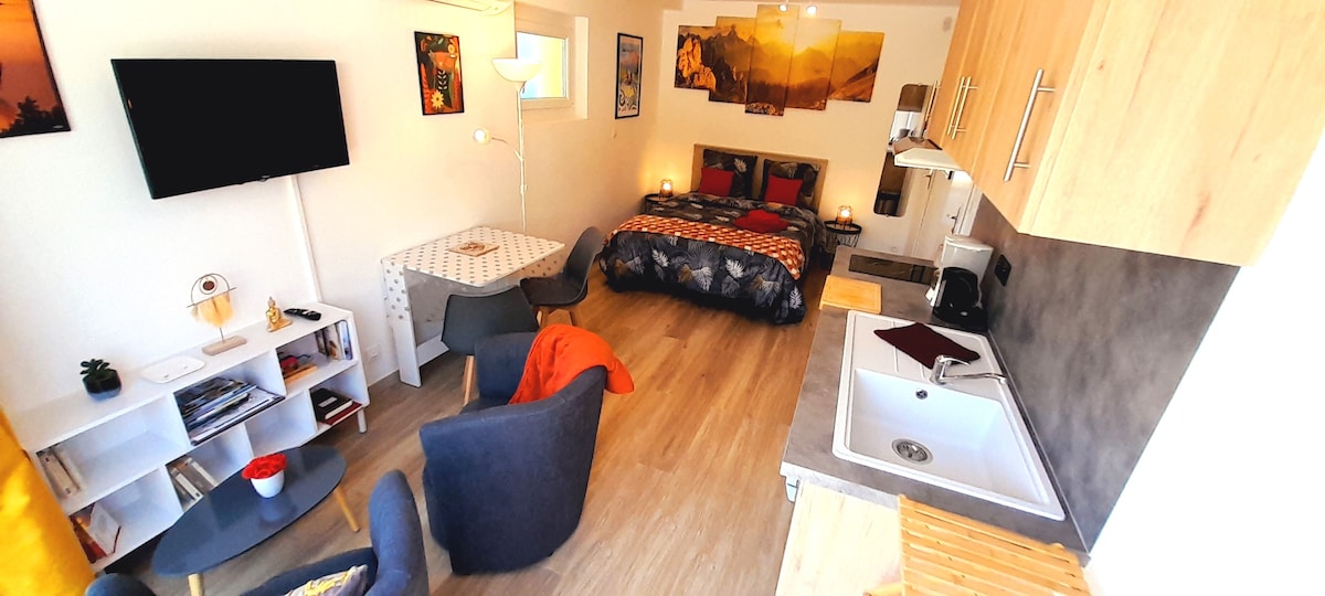 Appartement pour 5 avec entrée indépendante dans villa. 42 m², 2 chambres, 1 SDB, Cuisine équipée, lave vaisselle, lave linge, Beau et grand Jardin vue sur les montagnes, au calme. Piscine et jacuzzi partagés avec les propriétaires, de mai à septembre. A 5 minutes du centre ville, transports en commun à 300m, à 15 minutes du Golf de Bayard, 20 minutes des premières stations de ski, et du lac de Serre-Ponçon. Bus de ville gratuit avec un arrêt au bout de l'allée.