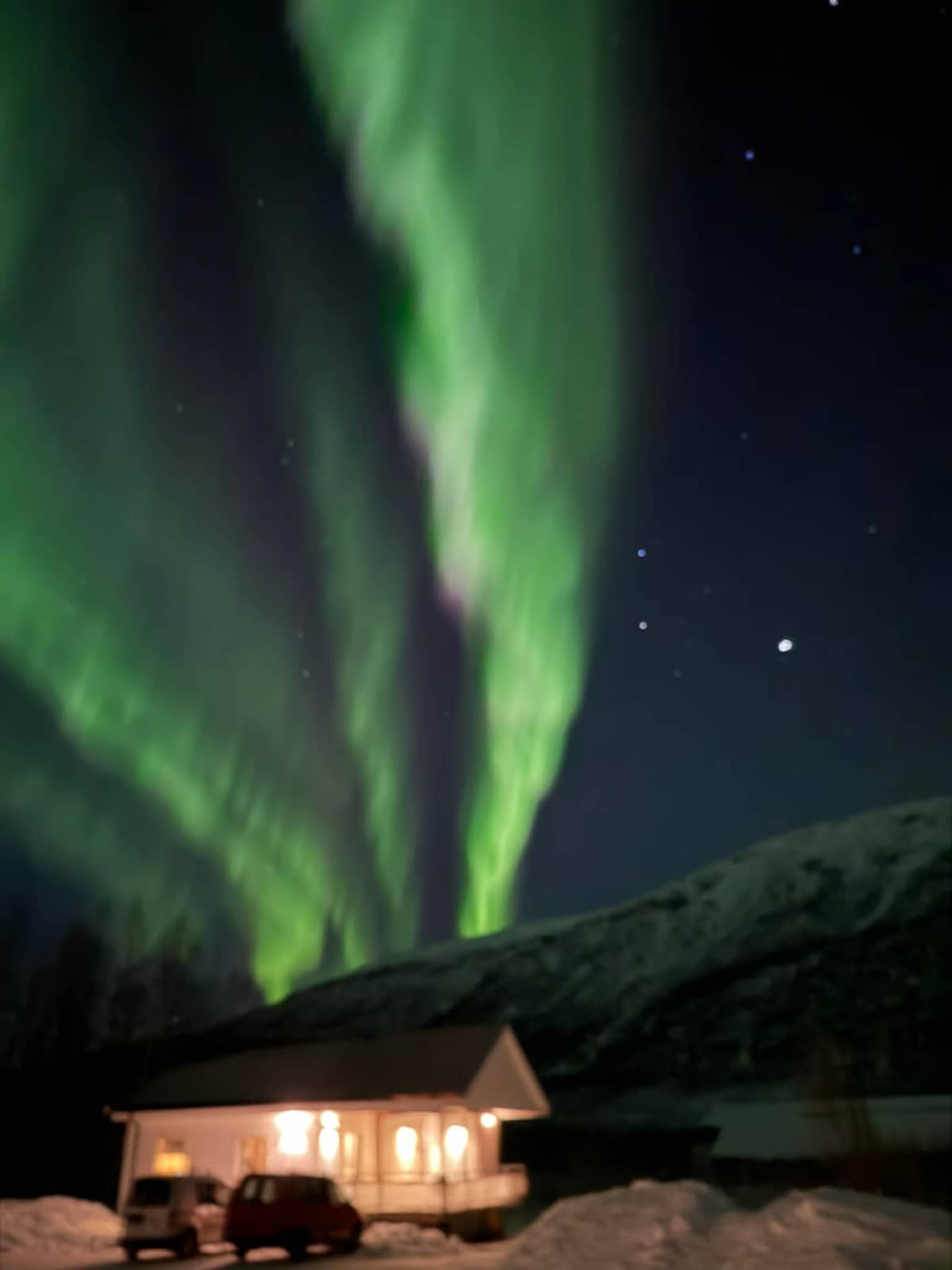Relax with the whole family at this peaceful place, on the halfway between Tromso and Lofoton by E6. 5-person cabin (2xdouble size bed, 1 single bed) with well-equipped kitchen, living room, bathroom and terrace. Nature surrounded, stunning landscapes, hike trails in the forest. Playground, BBQ House. Washing machine, dryer. Spa services: Sauna, Massage. Washing machine: 50 NOK Dryer: 50 NOK Bed linen: 100 NOK Dog: 150 NOK Extra cleaning: 150 NOK