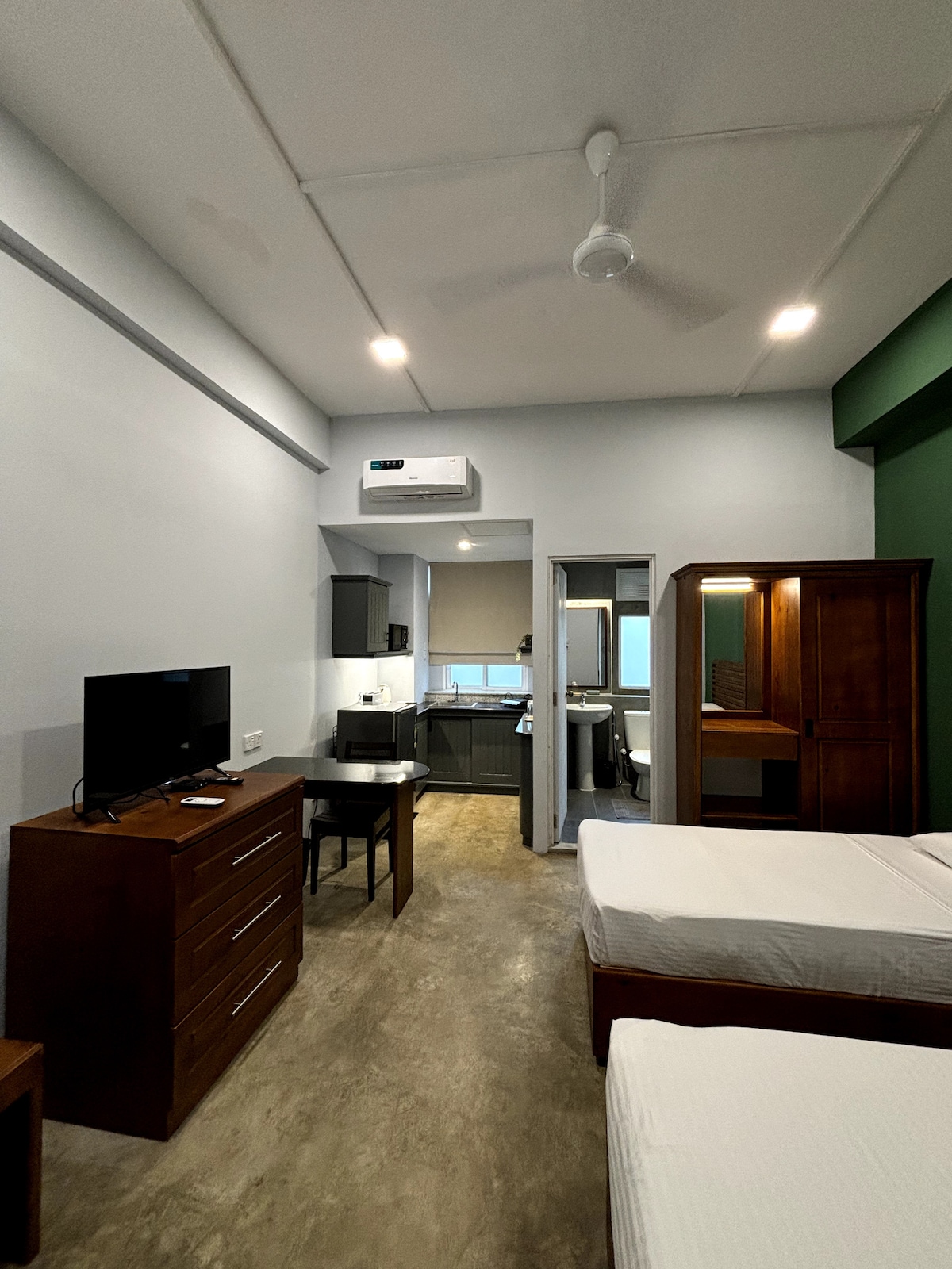 The entire 700 sqft studio apartment is exclusively for your use and located on the 5th floor of a commercial building, offering a panoramic view of downtown Colombo. The apartment is air-conditioned, tastefully furnished with modern amenities, and features a serene ambiance, ensuring your privacy at all times. Supermarkets, Cafes and Restaurants are 5 minutes’ walk from the location & it's not a shared premises. •Please note: No cooking is allowed as per fire regulations of the building.