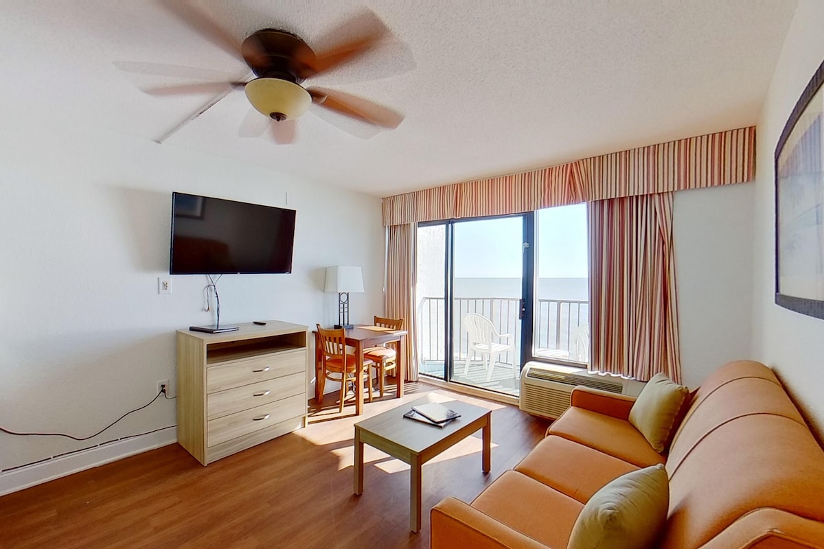 Discover your oceanfront retreat designed for couples or families with up to 6 guests who want resort amenities like pools and a lazy river, easy beach access, and a central location close to all that North Myrtle Beach has to offer! This beautiful 1-bed, 1-bath, 4th-floor oceanfront condo at Beach Cove Resort features a private balcony with views of the ocean and lush treeline.