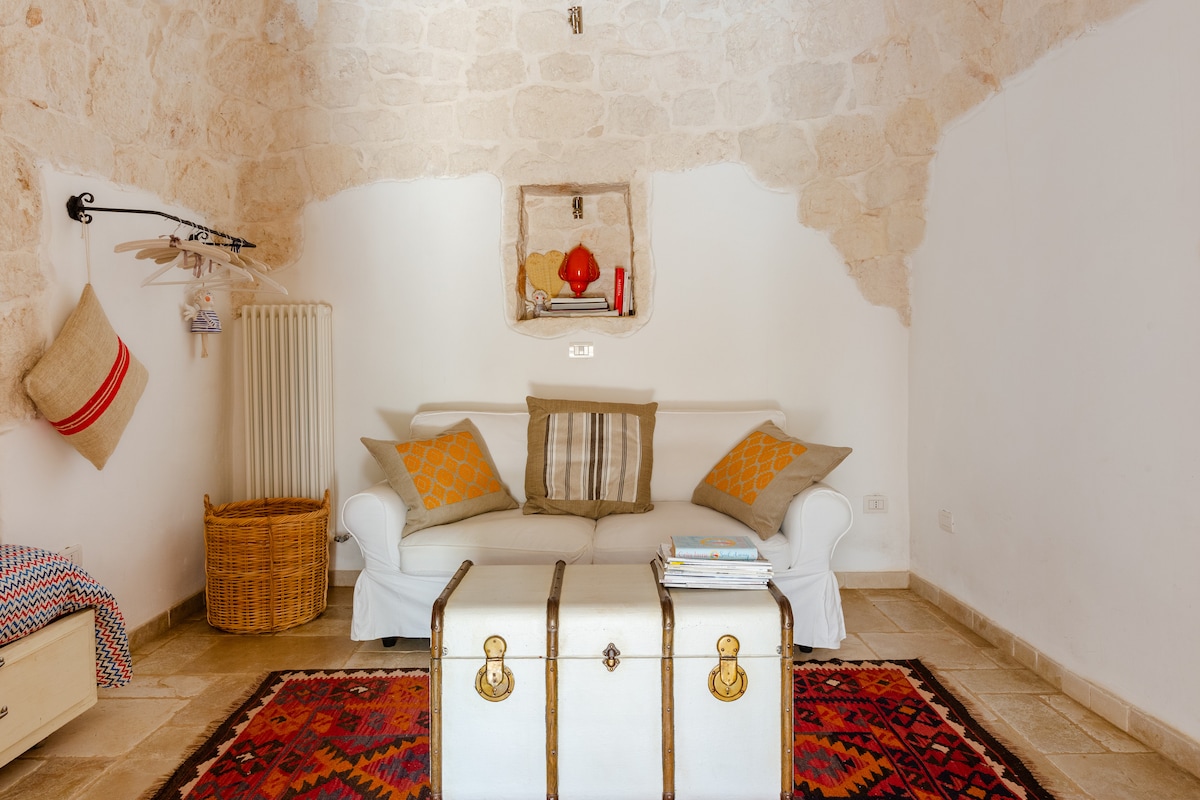 CIS: BR07401291000000188 CIN: IT074012B400033730 Vivi la magica sensazione di trovarti tra passato e presente: è una dimora storica! I pavimenti d'epoca e le pareti in pietra fanno da sfondo a un ambiente arredato con oggetti di design, vecchie ceramiche e mobili locali. L'ampio terrazzo privato, con solarium e doccia calda, saprà entusiasmarti: potrai rilassarti con un bicchiere di vino al tramonto, godere del sole su comodi lettini o preparare una cena in una magica atmosfera pugliese.