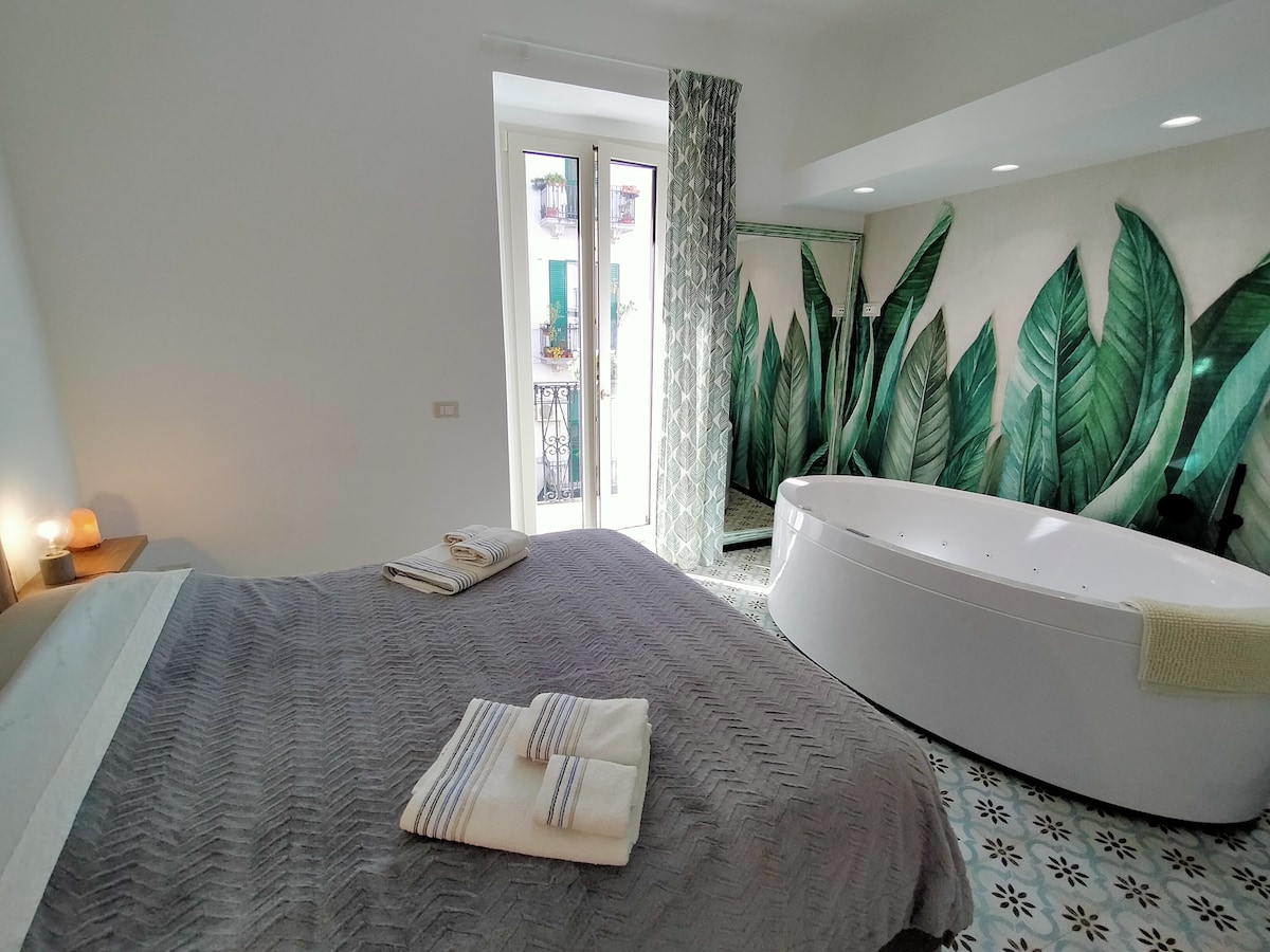 Una suite nel cuore del centro storico con le volte a botte e pavimento d’epoca. Finemente ristrutturata nel rispetto della sua essenza, senza trascurare i comfort per rendere unico il vostro soggiorno. Uno splendido terrazzo con vasca idromassaggio è pronto ad ospitare aperitivi e cene, in una location suggestiva ed intima. Le scale che conducono alla Suite e poi al terrazzo sono quelle tipiche del centro storico! Un po’ ripide alla vista, ma dotate di idonea illuminazione e doppio passamano!
