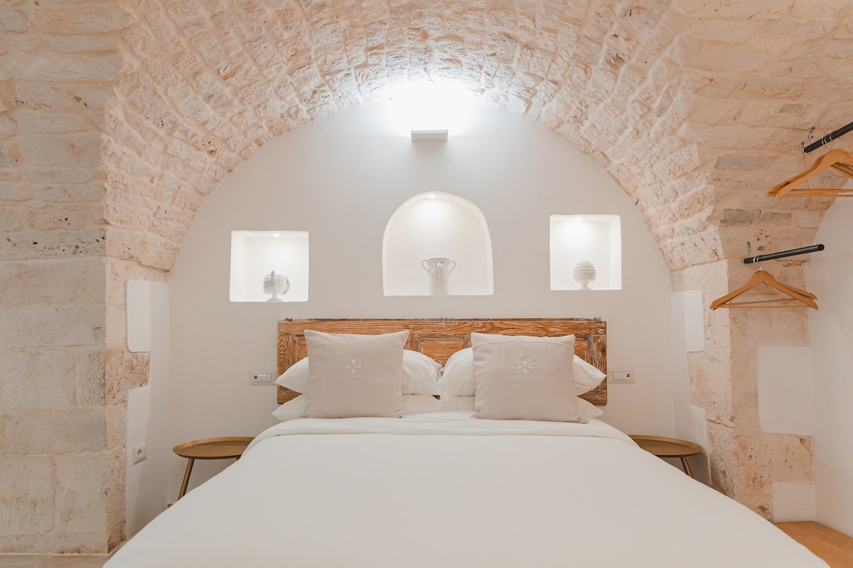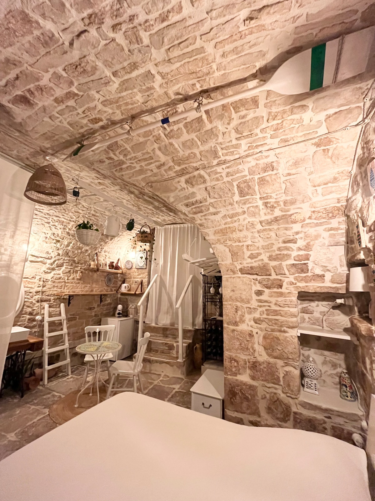 Vivi questo spazio incredibile, ricco di storia, situato in un contesto pittoresco. Al centro di un borgo di mare lontano dal turismo di massa. Pietra bianca naturale tutta intorno alla stanza e per terra la tipica “chianca” (temine medioevale che significa lastra di pietra) antica e originale. Ho cercato di lasciare il tutto più originale e rustico possibile per dare la sensazione agli ospiti di rivivere i tempi antichi in cui in questa camera ci viveva un’intera famiglia di 10 persone.