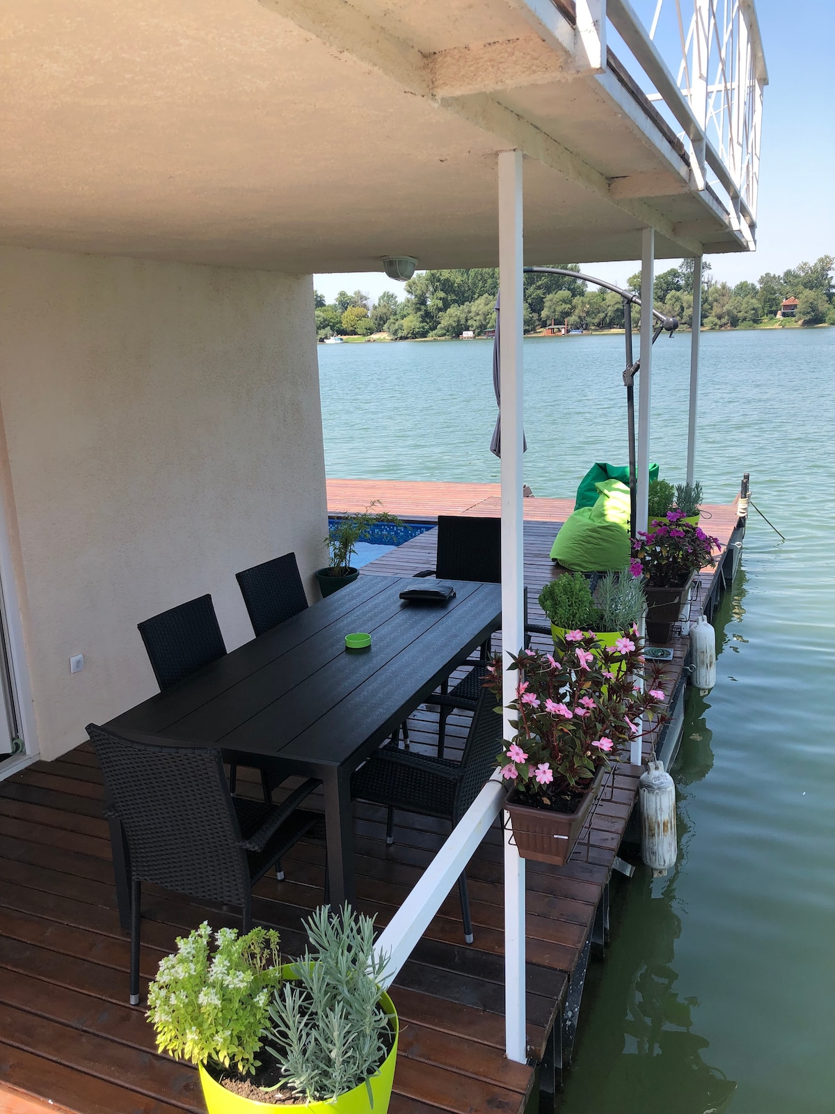 Luxury floating-house on the Sava river with private pool witch is designed to provide wonderful and unique experience. Just 10 minutes walk from famous city beach Ada Ciganlija. From city center 15 minutes by car and about 4 km distance from shopping center Ada mall that opened recently. Distance from airport is 25 minutes by car. Nearby you can find markets. Around floating-house there are 3 restaurants where you can eat fresh fish and many specialties.