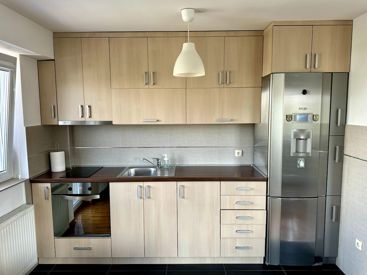 The apartment is full renovated a few months ago and everything is brand new. In the bedroom there is a large comfortable double bed and one big sofa bed in the living room. All in discreet led light. In the kitchen you can enjoy a modern flat-screen cooker, oven, refrigerator with freezer, dishwasher and washing machine and a large bar table. The bathroom is glazed with marble ceramics, it is very compact and clean. The bathroom is equipped with a hairdryer, towels, hygiene sets.