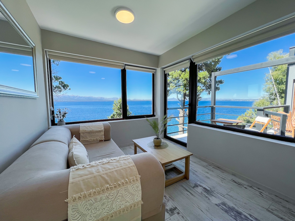 IMPORTANTE: EL ACCESO AL LAGO NO SE ENCUENTRA DISPONIBLE, POR OBRAS . El horario de obra es de lunes a viernes de 10 a 18 hs Cálido alojamiento equipado para 3 personas, con vistas únicas al lago Nahuel Huapi, desde el living, el balcón y la habitación . Ideal para parejas, quietud, paz, noches estrelladas. Estacionamiento privado para auto/camioneta Acceso a Cerro Catedral a 10 km del alojamiento y Piedras Blancas a 5 km. Experimente Bariloche en su esplendor.