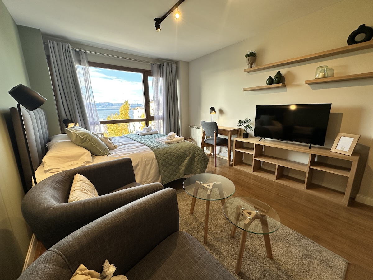 Exclusive 2-room apartment for 5 people on the second floor, facing the lagoon, with panoramic views of the lagoon, Nahuel Huapi Lake, Bariloche, and the mountains. Includes a bedroom with double bed, double sofa bed (bed + trundle) and a foam sofa bed for a child up to 12 years old (max. 90 kg, 65×190×18 cm). Fully equipped with large fridge, electric stove and oven, outdoor electric grill, toaster, coffee maker, microwave, and hair dryer.