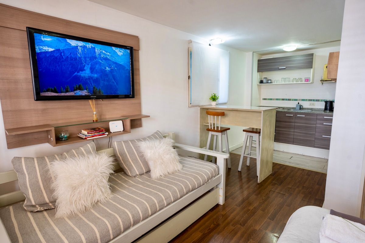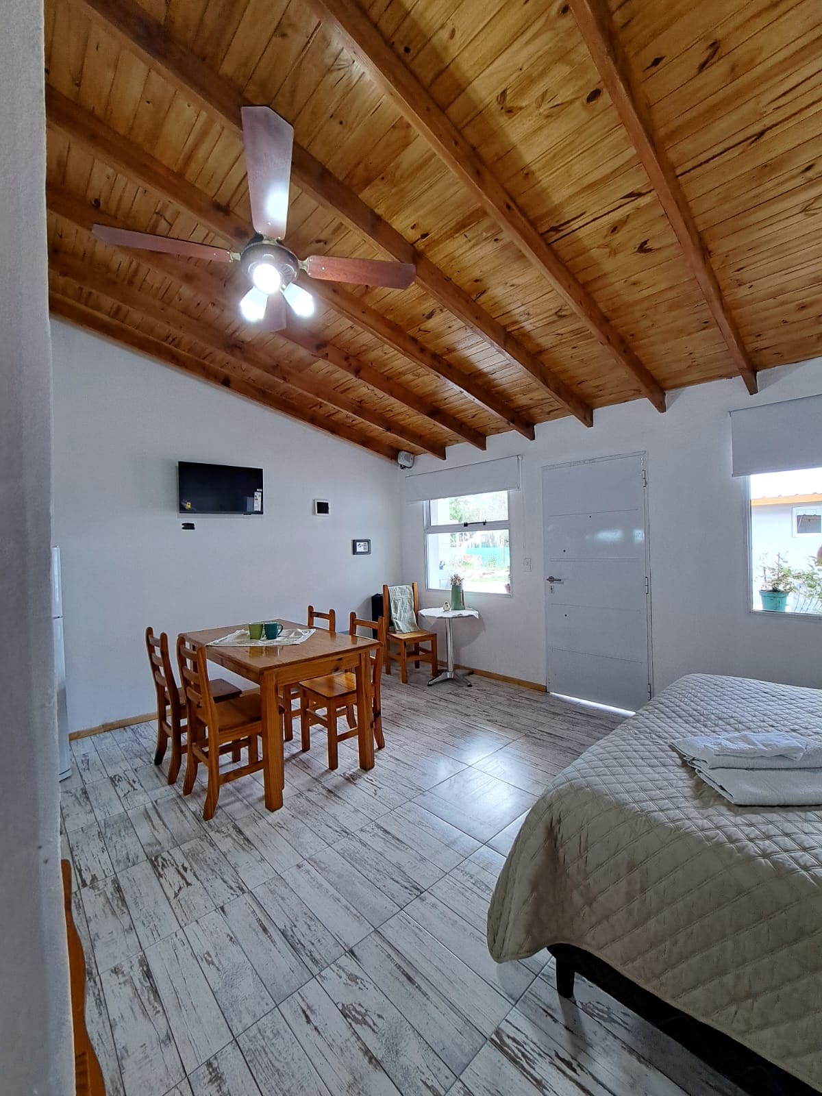 Relájate en este alojamiento bonito, acogedor y tranquilo. Monoambiente nuevo 32 m2, equipado para 2 adultos. Decoración estilo vintage-nórdica. Cochera propia al aire libre dentro del predio cerrado incluida en la estadía. Baño con bañadera con ducha, bidet, inodoro, vanitory. Dormitorio con somier de 2 plazas. Cocina comedor completamente equipada. Mesa, sillas y futón de madera. Textiles Televisor 24" Chromecast. Internet. Frente vidriado con 1 puerta y 1 ventana. Vista al lago y montañas