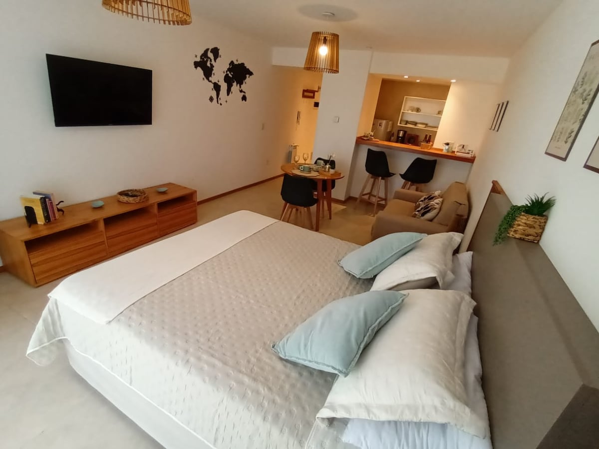 Calido apartamento ven el corazón de Bariloche, muy confortable. Mi alojamiento es ideal para familias. Muy luminoso con balcón . Cerca de los medios de transporte que te llevarán a recorrer todo Bariloche. A minutos de la terminal de ómnibus. A 4cuadras del centro cívico. A 1 cuadra de la calle principal. Frente a la catedral. Muy equipado con todo lo que necesitas para pasar una estadía increíble !Muy calentito!. Es apto para 5 personas. No posee COCHERA