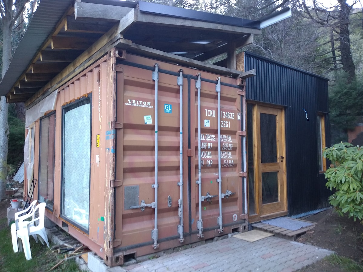 Casita reciclada de contenedor marítimo 5 cuadras de el centro y del súper cafés bares restaurantes y la feria artesanal. Sobre el pie de la montaña con un bosque nativo en el patio trasero desde donde se puede acceder al cerro amigo en un hike de 20 minutos . Las casitas están completamente equipadas y hay estacionamiento disponible en la entrada . El Barrio cuenta con un portón de segurigad y la calle es sin salida . Es muy tranquilo y a pasos del centro . ❤️🌳🌍