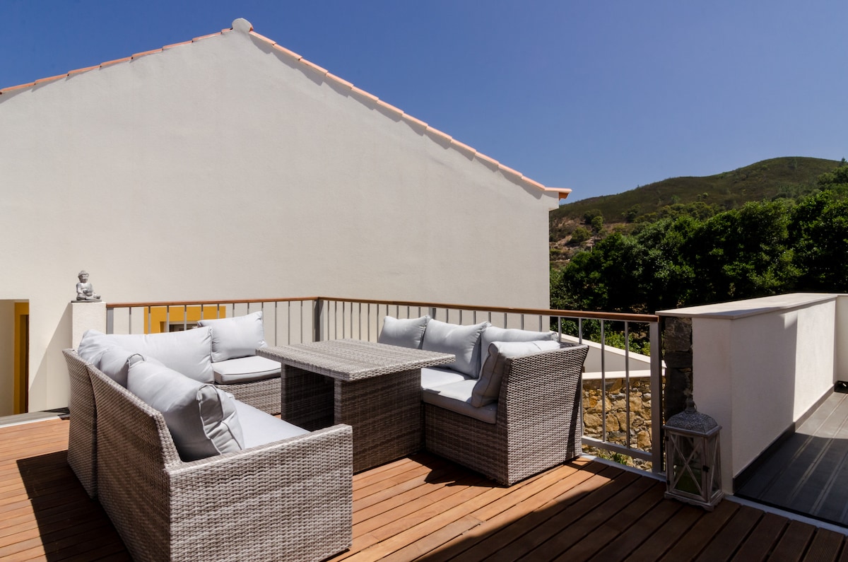 Stay at Casa Alva in our modern studio apartment, located in the middle of the hills, just outside of Aljezur town and nearby all West coast beaches. In the air conditioned studio you find on ground floor a light and spacious living room with sofa bed, open kitchenette and private bathroom with bath. Upstairs there is a large double bed / two single beds. The studio has private parking in front and is located on the ground floor, with the terrace overlooking the hills.
