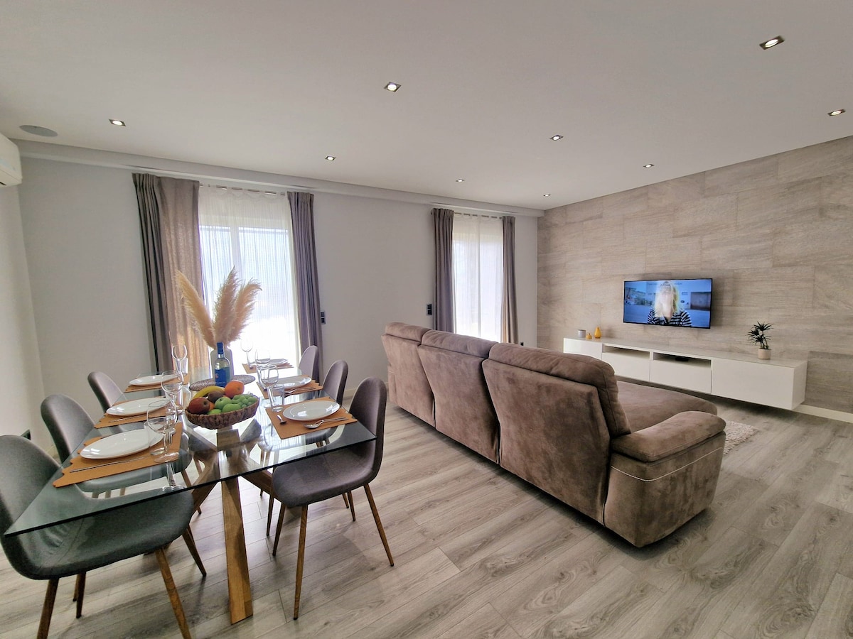 Casa Child friendly, totalmente equipada com 3 quartos, 2 casas de banho, cozinha, casa de jantar e sala de estar com vista e acesso para o pátio e piscina. BBQ e mesa para refeições ao ar livre e ainda terraço para banhos de sol. Piscina com grades, por isso é o local perfeito para férias em família com crianças. Pequeno almoço e transfer de/para aeroporto (custo adicional) Estacionamento privado Ar condicionado, wi-fi 1000Mb/s, smart tv, Netflix welcome drink. Beauty & wellness experiences.