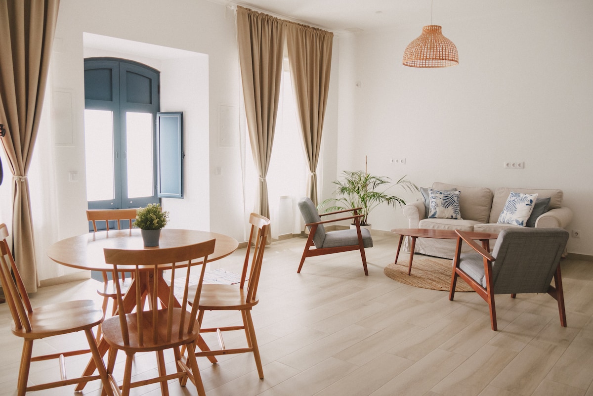 Open space apartment decorated with beachy vibes right at the downtown center of Faro. Especially recommended to couples. It is on the last floor of a small three-storey building having a rooftop above it with some plants, a table, couple of chairs and a shower head for a quick fix on those days after the beach and a table with some chairs where you might lounge at during the sunset and longer nights.