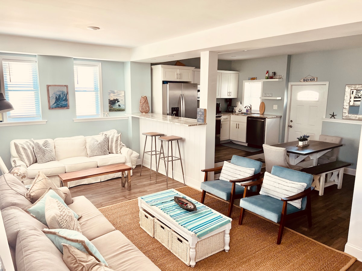 900 sq ft fully renovated apartment with top end appliances, washer/dryer, and 10 foot ceilings less than 8 houses from the beach in Long Beach Island. A fairly short walk to the Hotel LBI!! Beach badges are included for June through August! Linens and bath towels are included as well!