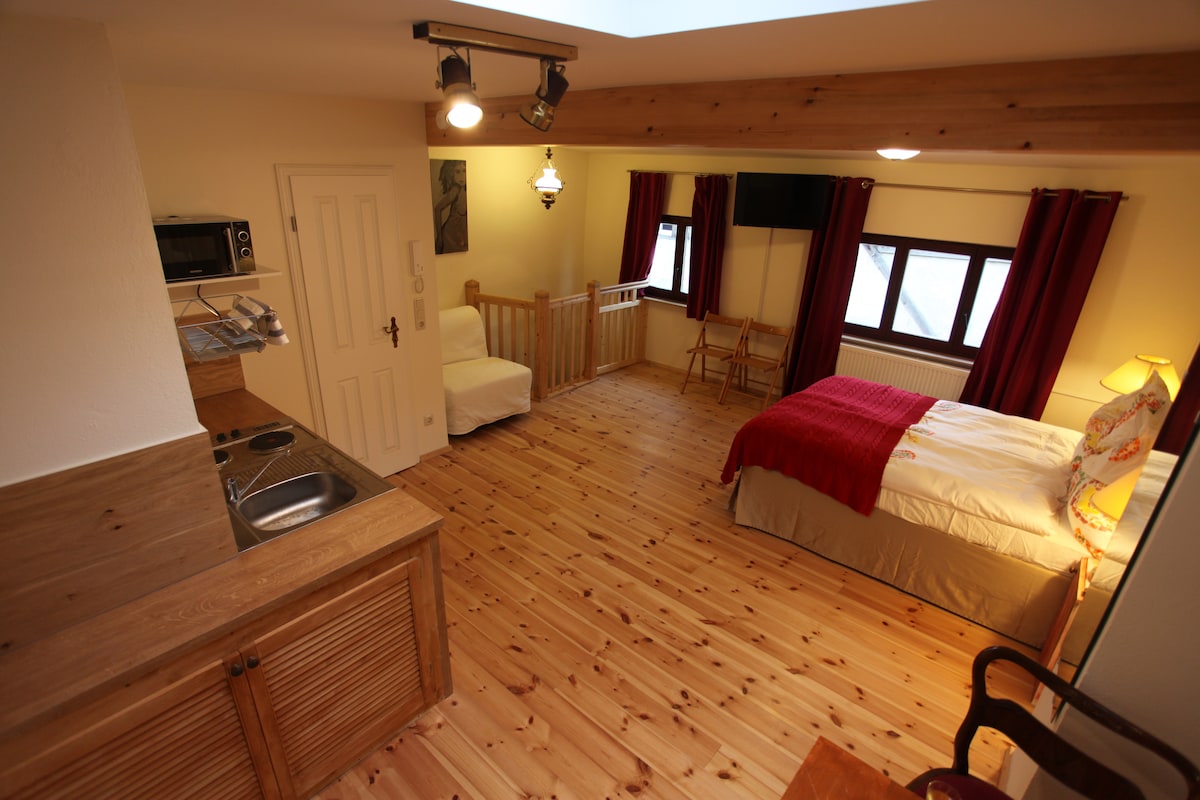 Unsere kleine ,feine Ferienwohnung befindet sich im Obergeschoss unseres Wohnhauses .Die Ferienwohnung erreicht man über einen separaten Eingang. Wie auf den Fotos zu sehen, gibt es einen großen Raum , von dem eine kleine Küche abgeteilt wurde. Die Küche verfügt über ein Cerankochfeld, Wasserkocher und Filterkaffeemaschine , sowie übliches Geschirr. Im Wohn/Schlafbereich befindet sich ein schönes Bett (2x2) sowie ein paar kleine Schränkchen. Außerdem gibt es ein wunderschönes Bad mit Dusche.