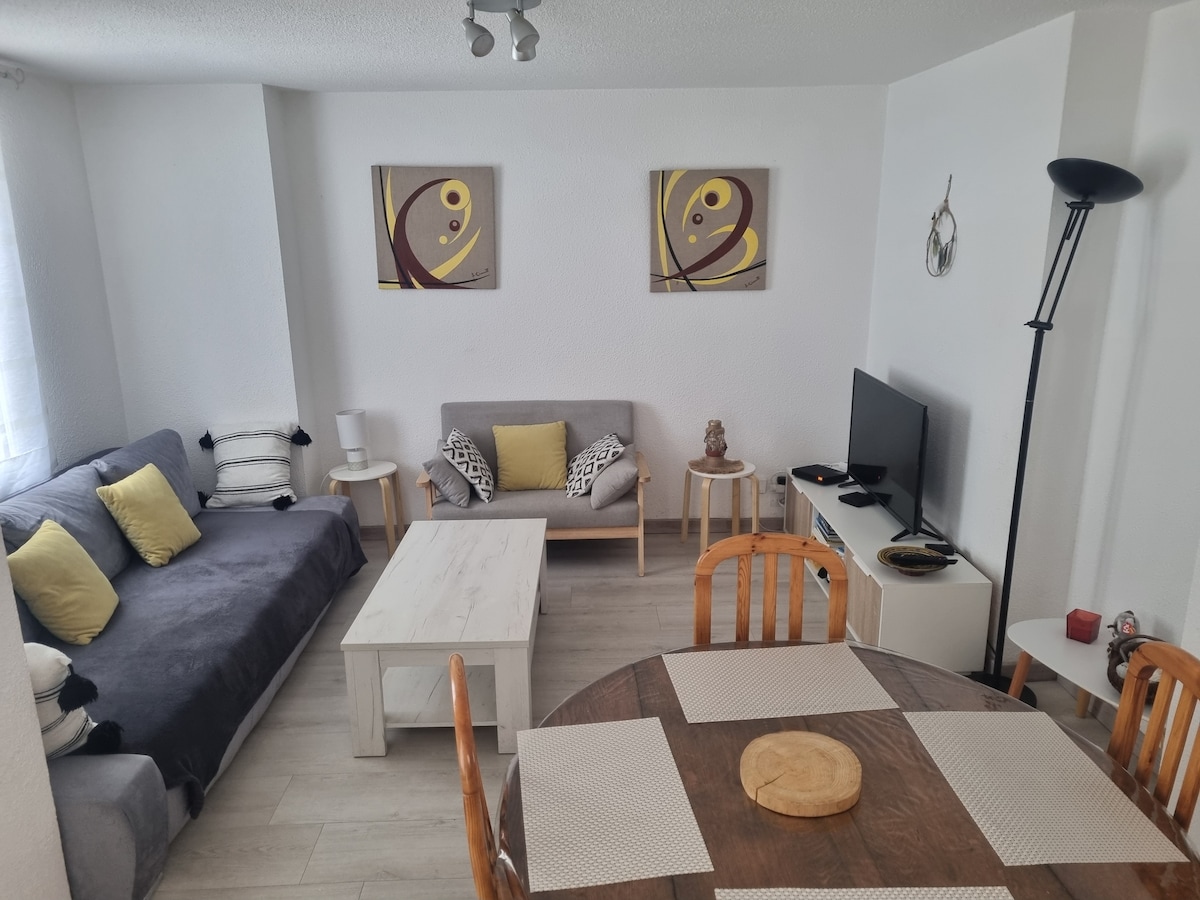 Appart entièrement rénové : séjour avec cuisine équipée (frigo-congélateur, plaque induction, four micro-ondes chaleur tournante, lave-vaisselle), canapé lit , chambre avec ensemble de 2 lit 90*200 électriques et salle de douche avec machine à laver. Chaise haute et lit parapluie. Linge de toilette et draps fournis. Wifi dans l’appartement. Tv Chromecast.
