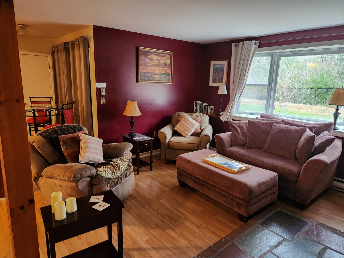 A one-bedroom cottage that sleeps 4, nestled into the hillside at the top of the wetland. Great for birding! Located on a beautifully landscaped property walking distance to Lecount Hollow Beach. The bedroom has a queen bed and there is a queen and a single sleep sofa in the finished basement. There is also a studio apartment available on the premises that sleeps two. The listing name is "Comfortable Studio Apartment".(Pets are allowed in the studio appartment)